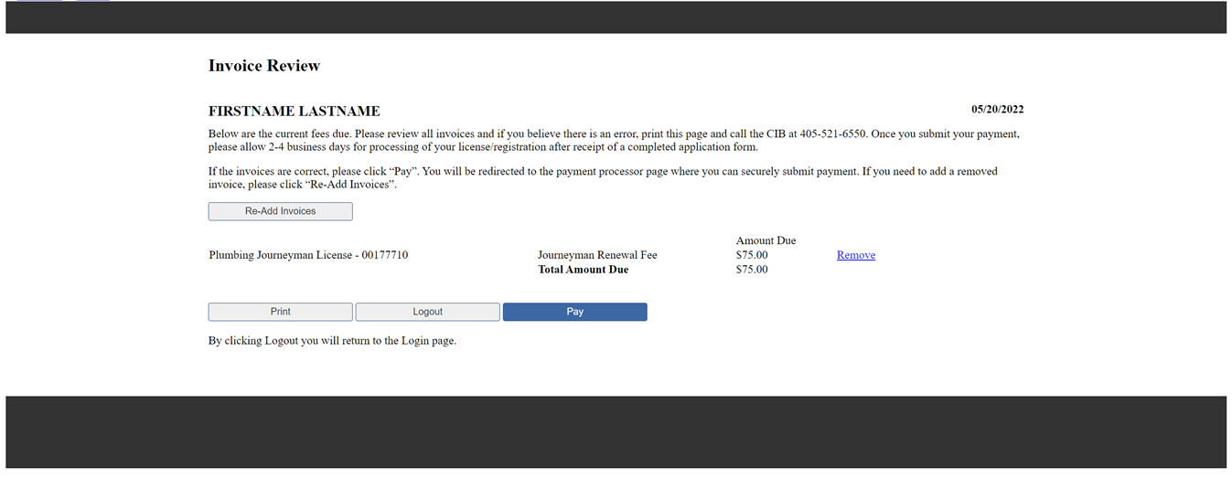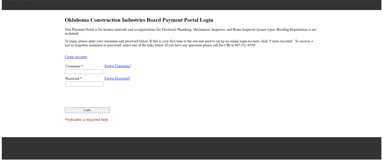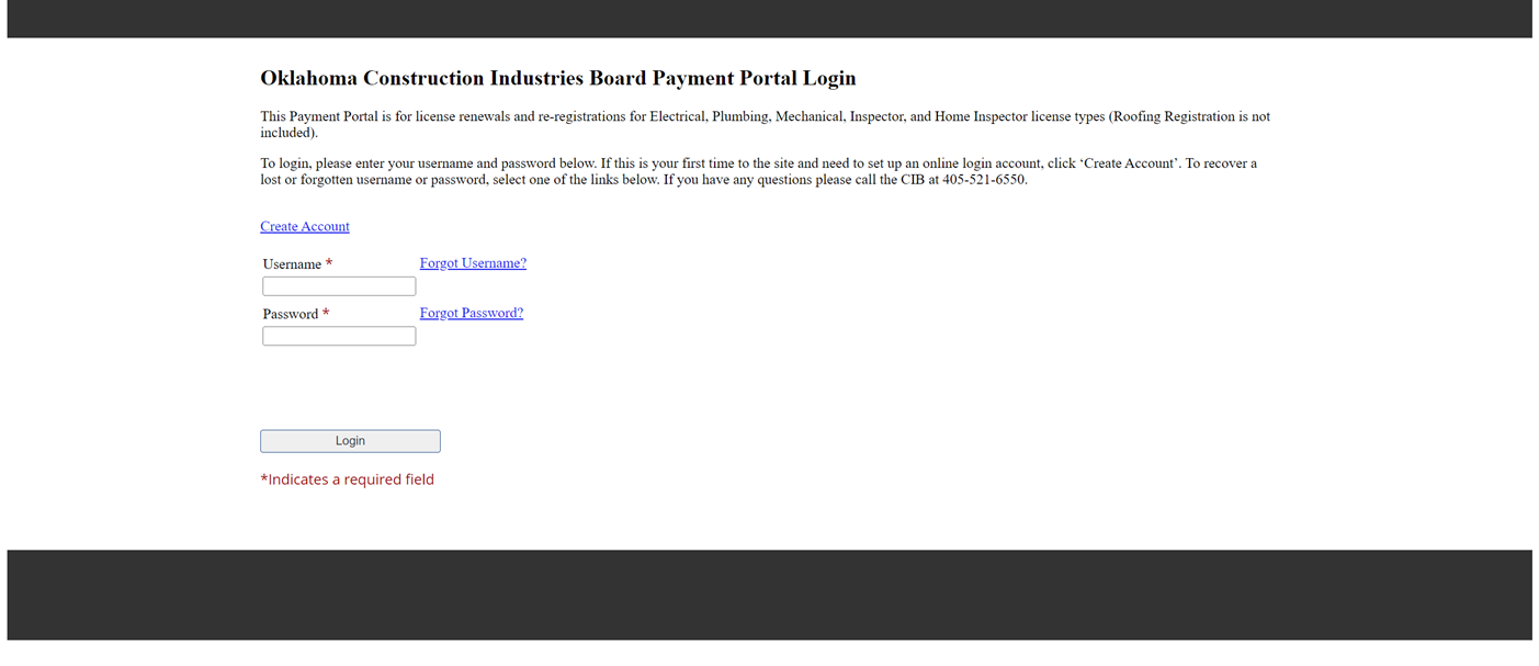 This Payment Portal is for license renewals and re-registrations for Electrical, Plumbing, Mechanical, Inspector, and Home Inspector license types (Roofing Registration is not included)