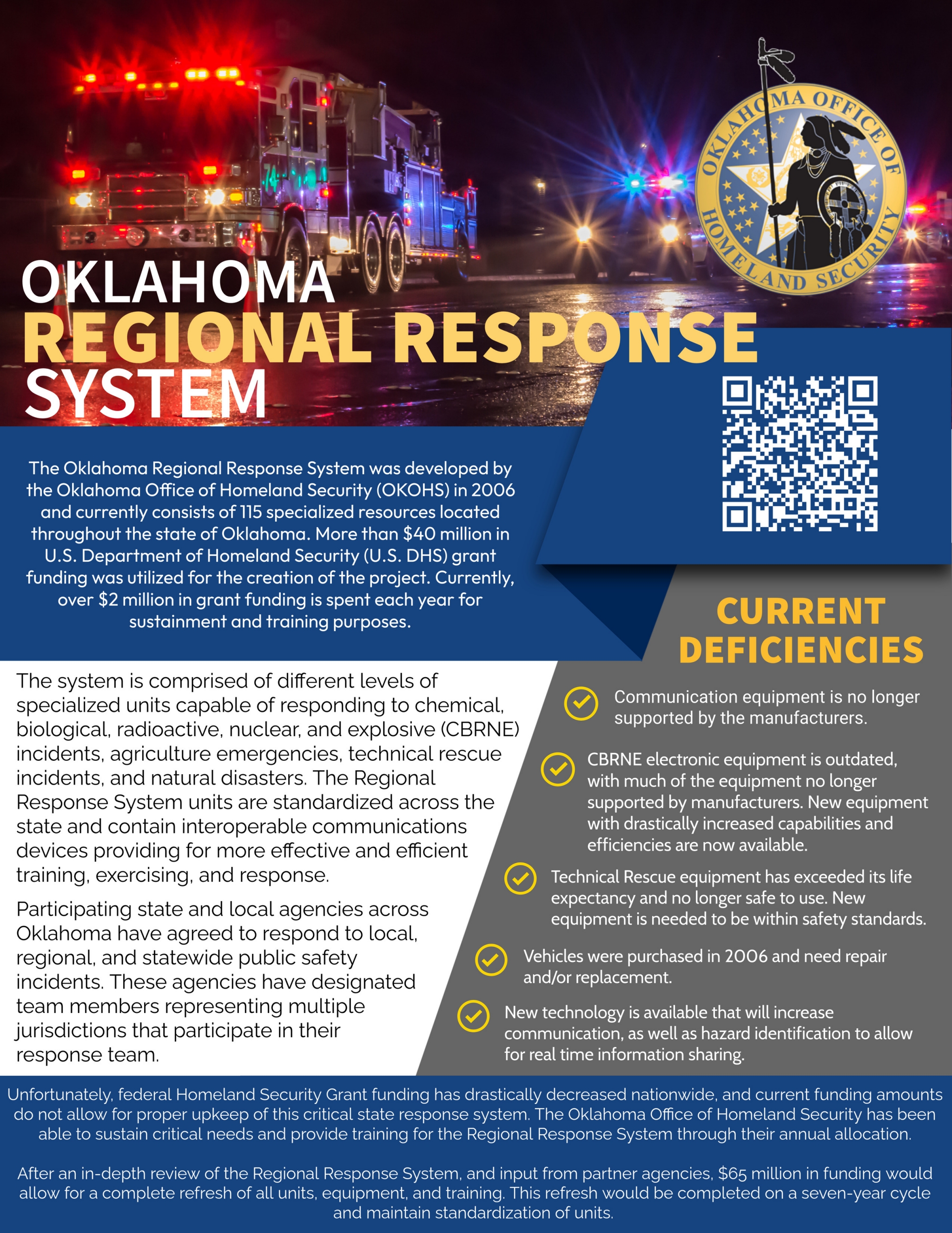 The Oklahoma Regional Response System was developed by the Oklahoma Office of Homeland Security (OKOHS) and currently consists of 113 specialized resources located throughout the state of Oklahoma. More than $35 million in U.S. Department of Homeland Security (U.S. DHS) grant funding has been used for this project.