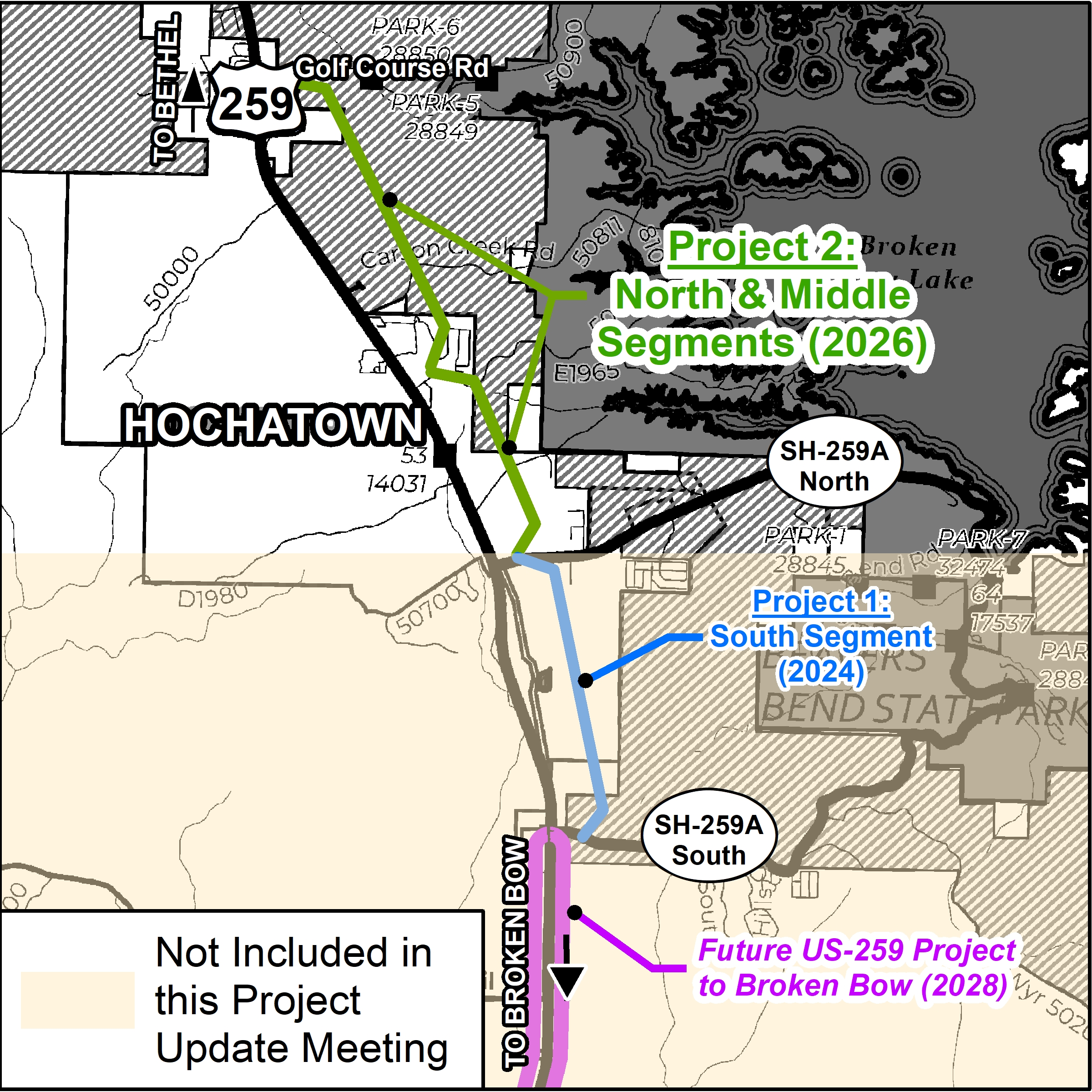 During initial public outreach and preliminary studies, the proposed improvements for the 6 miles of US-259 through Hochatown were described in three areas called South Segment, Middle Segment, and North Segment. For final design and construction, the South Segment is scheduled to proceed first, so it is called “Project 1”. Project 1 is generally between SH-259A South and SH-259A North. Project 1 is scheduled to start construction activities towards the end of 2024 and beginning of 2025. Project 1 is not part of the proposed improvements addressed by this Project Update Meeting.