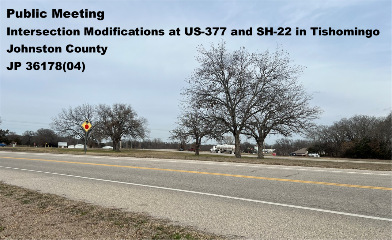 ODOT, in cooperation with the Federal Highway Administration, proposes to make intersection modifications to the US-377 and SH-22 junction west of Tishomingo, Oklahoma. The existing US-377 and SH-22 are 2 lane highways that junction at a Y-intersection. The purpose of the project is to improve safety and operational efficiency of the intersection.