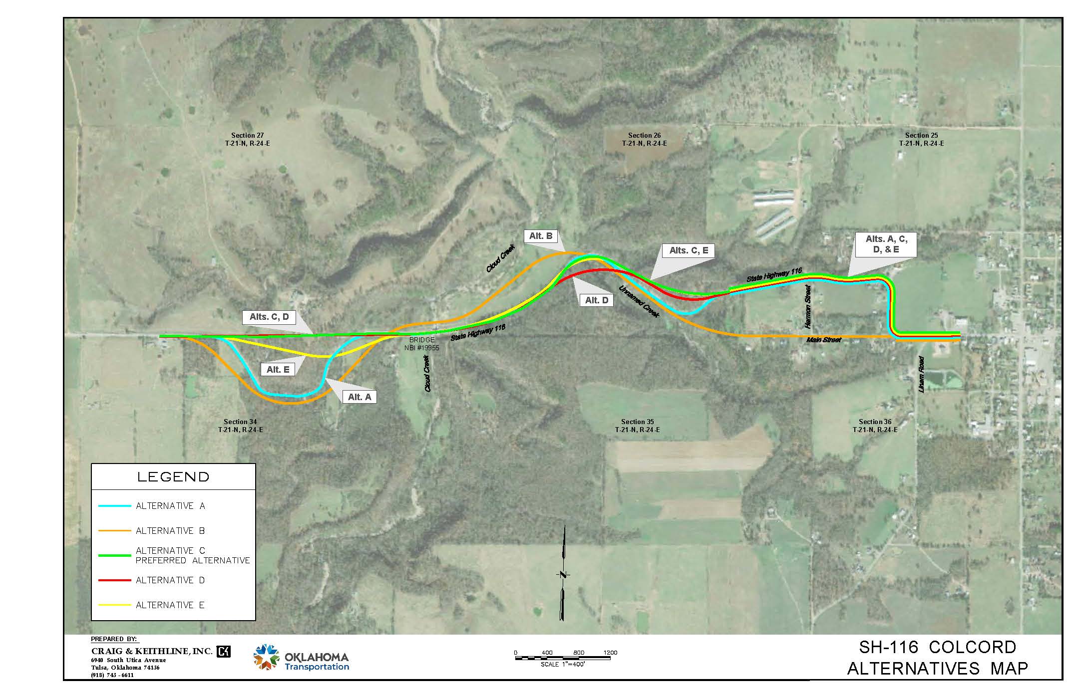 ODOT, in cooperation with the Federal Highway Administration (FHWA), is proposing roadway improvements on SH-116 from approximately 2.0 miles east of US-59,extending east approximately 2.2 miles to Colcord in Delaware County. This segment of SH-116 has inadequate shoulders, sharp curves, and steep hills and valleys which result in limited sight distance. The purpose and need for this project is to correct substandard geometry, add shoulders and improve safety.ODOT has tasked a Consultant to determine the best alternative for correcting the roadway deficiencies while taking into consideration construction costs, right-of-way and utility costs, and environmental constraints.