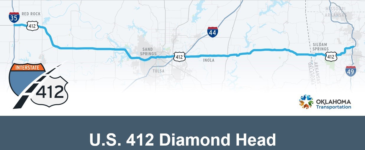 The Oklahoma Department of Transportation (ODOT) invites you to attend a public meeting regarding a new interchange affecting access at U.S. 412 and Diamond Head Drive in Sand Springs, OK. At this meeting, the project team will present solutions to address the at-grade intersection with U.S. 412. A brief presentation will begin at 5:45 p.m., followed by an open house where the public can meet with project team members and ask questions. Although a brief presentation will be made, the public is invited to attend at any point between the time listed on this invitation.