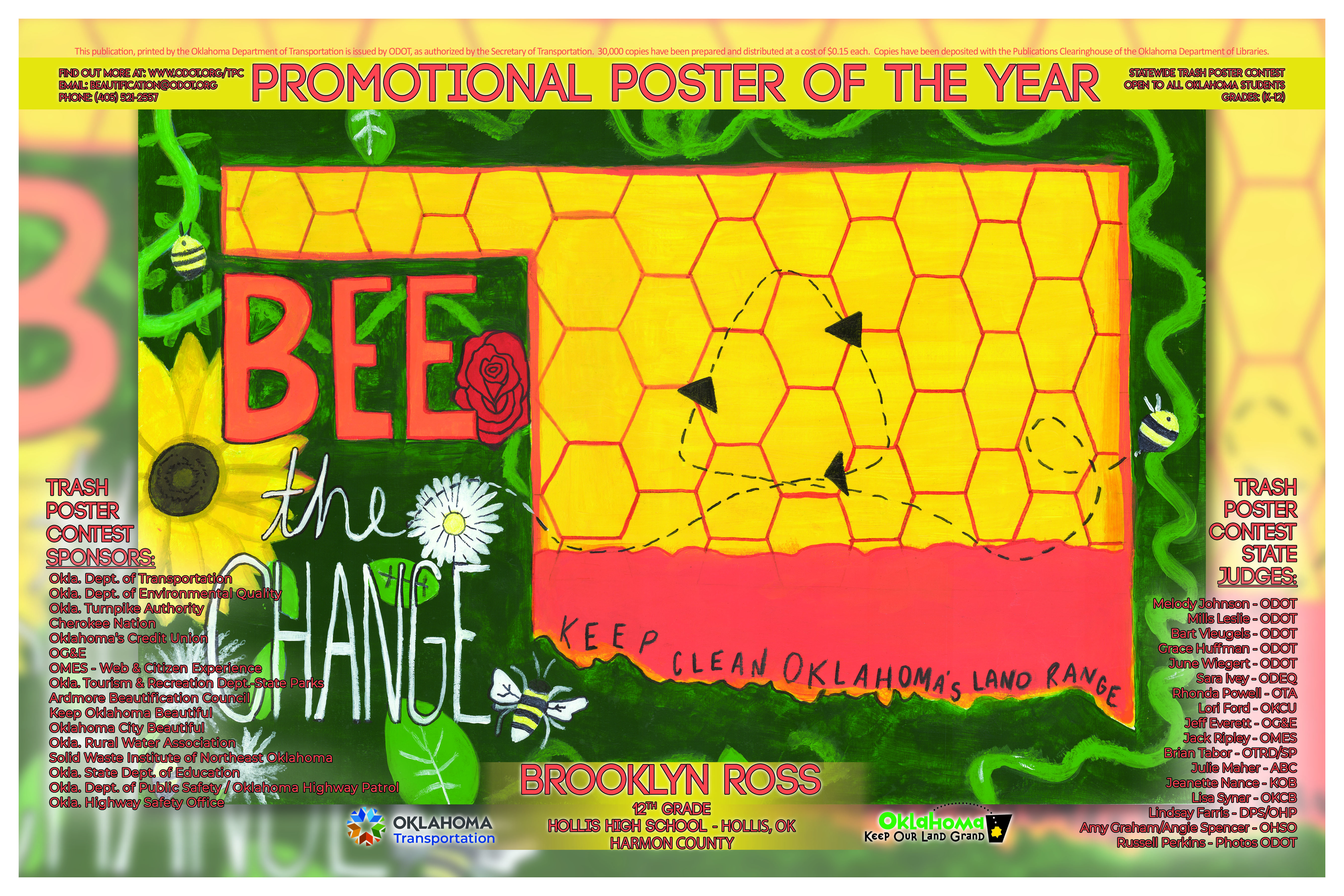 The Trash Poster Contest is organized by State Beautification Coordinator Melody Johnson – Oklahoma Department of Transportation (ODOT), and is coordinated in partnership with the following representatives from their respective agency or organization: Sara Ivey – Oklahoma Department of Environmental Quality (ODEQ), Rhonda Powell – Oklahoma Turnpike Authority (OTA), Patrice Williams - Oklahoma Turnpike Authority (OTA), Lauren Fishinghawk - Cherokee Nation (CN), Jeff Everett – OG&E (OG&E), Brandon Holcomb – Oklahoma’s Credit Union (OKCU), Jack Ripley - Office of Management & Enterprise Services (OMES), Brian Tabor – Oklahoma Tourism & Recreation Department – State Parks (OTRD-SP), Jeanette Nance – Keep Oklahoma Beautiful (KOB), Julie Maher - Ardmore Beautification Council (ABC), Lisa Synar – Oklahoma City Beautiful (OKCB), Bill Hix - Solid Waste Institute of Northeast Oklahoma (SWINO), Elizabeth Maughan – Oklahoma State Department of Education (SDE), Lindsey Farris – Oklahoma Department of Public Safety/Oklahoma Highway Patrol (DPS/OHP), and Amy Graham – Oklahoma Highway Safety Office (OHSO).
