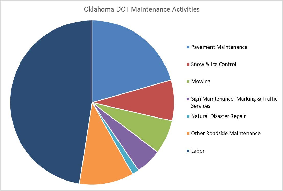 ODOT is responsible for the maintenance of property included on, and in the right-of-way along, the state highway system. The maintenance of pavement, snow and ice removal, and mowing account for a large share of the annual maintenance budget. The following chart provides information about the share of the major categories and activities completed with funds in the maintenance budget.