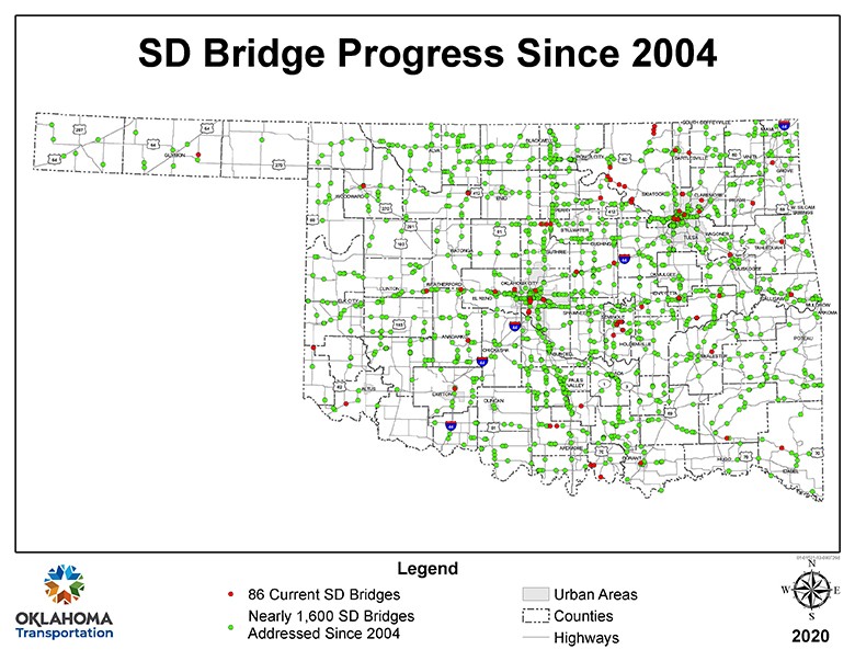 • April 2004: Bridge inspections show 1,168 out of 6,800 total highway bridges are rated structurally deficient, an all-time high for Oklahoma