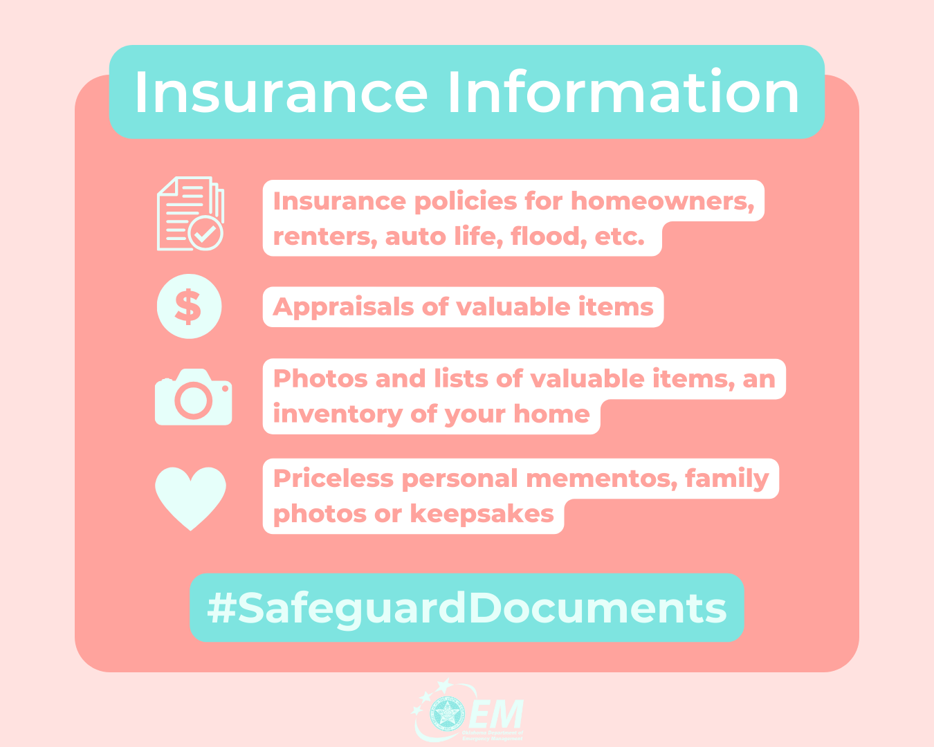 Having insurance for your home or business property is the best way to make sure you will have the necessary financial resources to help you repair, rebuild or replace whatever is damaged in a disaster. Have the proof you need to get assistance - be sure to store the following in a safe place: