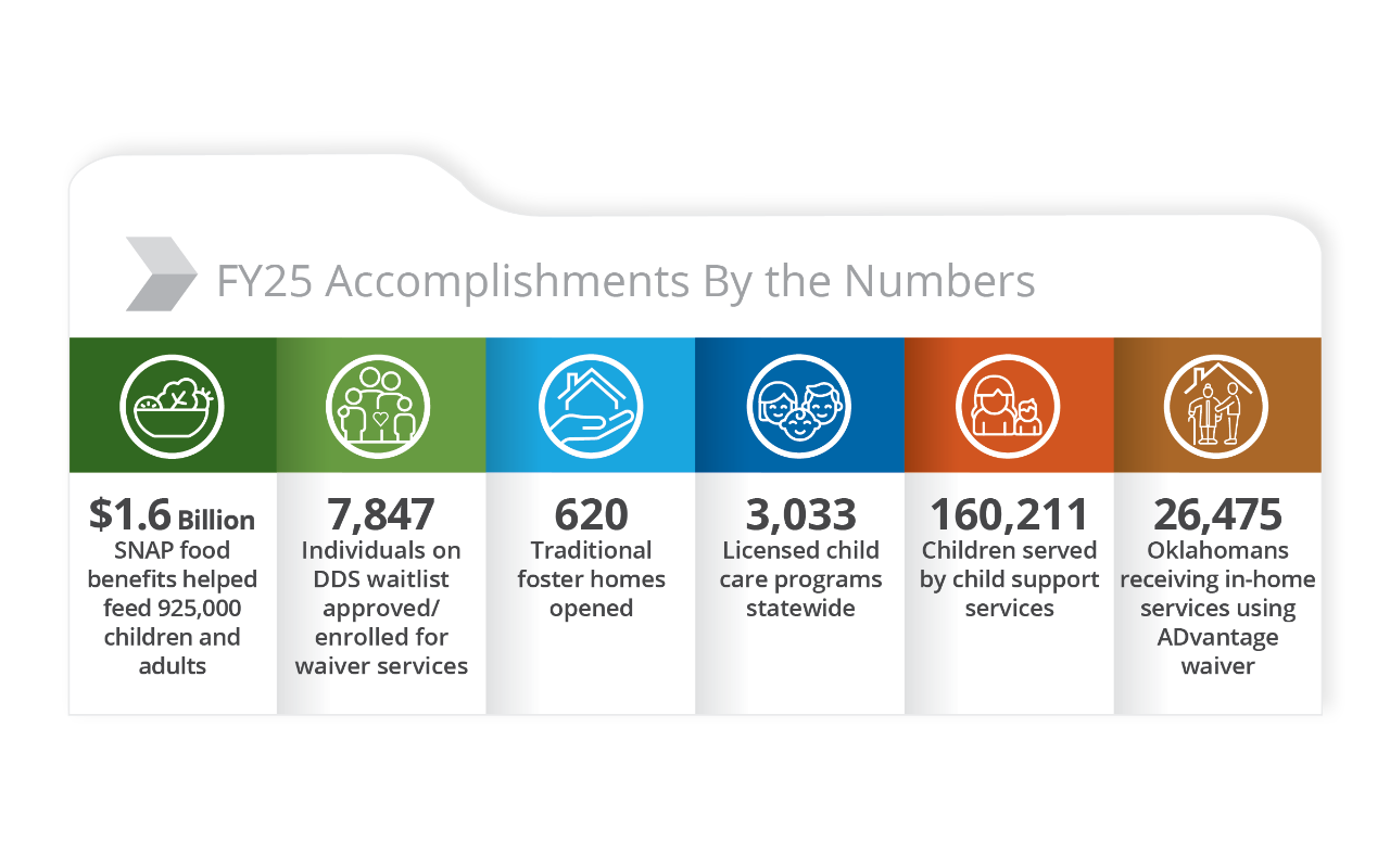 In Fiscal Year 2025, Oklahoma Human Services connected more than one million Oklahomans—nearly one in four residents—to vital services that support health, well-being, and opportunity. This incredible impact was made possible by our dedicated team of nearly 6,000 compassionate professionals working across the state.